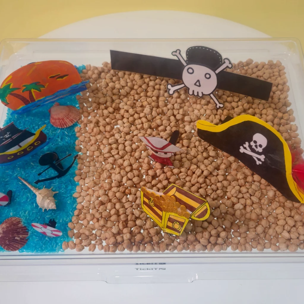 Mesa sensorial pirata con legumbres: trasvases, texturas y búsqueda del tesoro