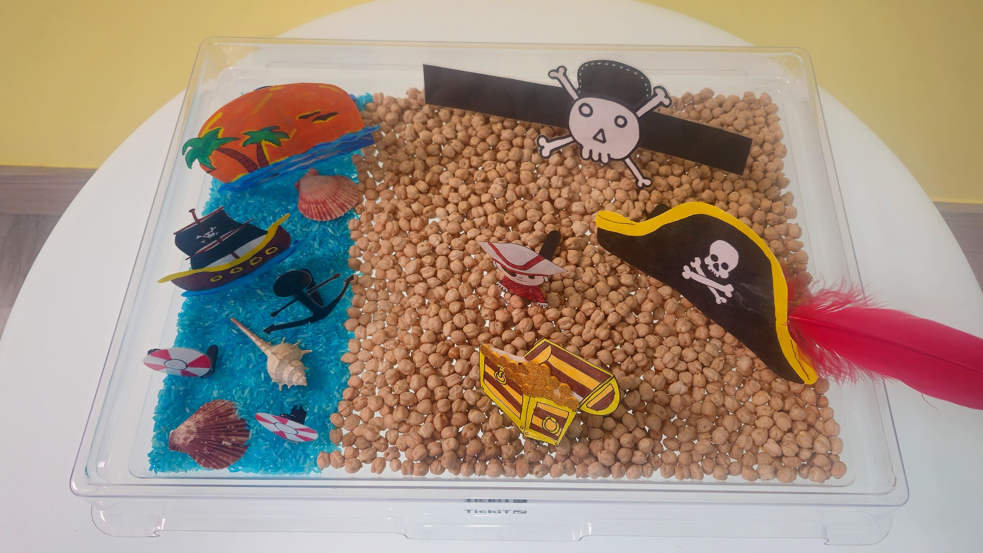Llevábamos varios días calentando motores con la temática pirata (sí, también con disfraces para el Entroido), y queríamos que la aventura se viviera con las manos. Así que preparamos una propuesta que en 0–3 funciona de maravilla: una mesa sensorial.